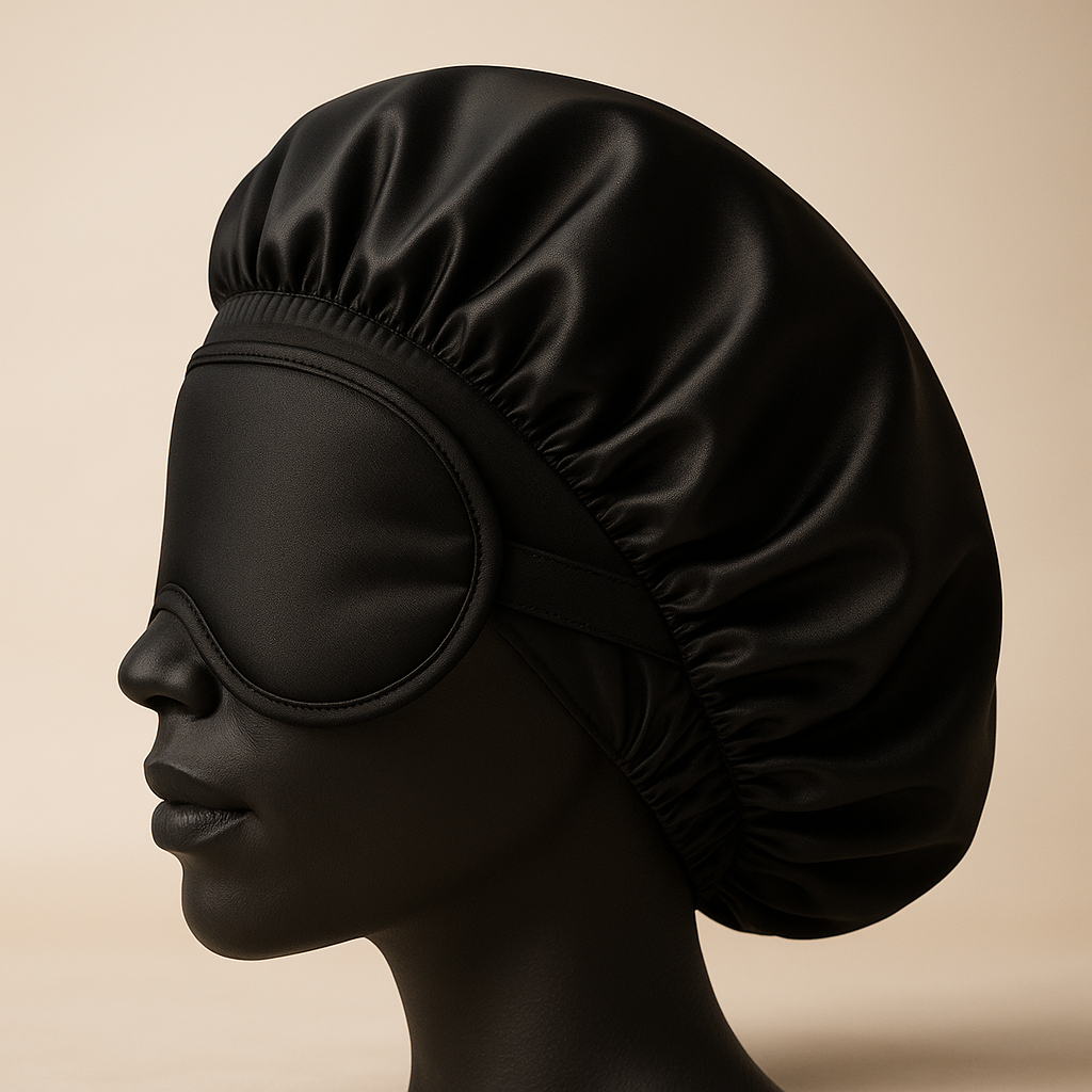 A hair bonnet made of mulberry satin is worn over the hair to protect it, especially while sleeping. The mulberry material keeps your hair smooth, prevents frizz, split ends, breakage, and preserves moisture. The bonnet has a wig band for security, non-slip, and comfort. A bonnet combines with a sleep eye mask, slightly padded to wear over your eyes to block out light and help you sleep better. The mask creates a calm environment, which can improve sleep quality, especially in bright and distracting sounds, and is secured to the bonnet by detachable velcro or buttons.